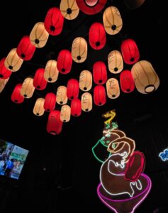 À quelques minutes de Peumayén, Sarita Colonia propose une expérience totalement différente, plus festive et décalée. Dès l’entrée, le ton est donné : vous comprenez que vous n’êtes pas dans un restaurant classique, entre néons colorés, objets religieux détournés et détails kitsch, Sarita Colonia vous plonge directement dans une ambiance unique. Le ceviche est frais, bien acidulé, les tiraditos délicats, et l’on retrouve cette cuisine fusion péruvienne-chilienne qui fait toute la richesse du lieu. Certains plats jouent sur des contrastes sucré-salé ou pimenté très typiques du Pérou, tandis que d’autres options, notamment végétariennes, permettent à chacun d’y trouver son équilibre. Nous vous conseillons de venir à plusieurs pour goûter un peu à tout, c’est clairement là que l’expérience prend tout son sens. En fin de soirée, l’ambiance devient plus animée, presque festive. C’est une adresse parfaite pour prolonger votre soirée à Bellavista.