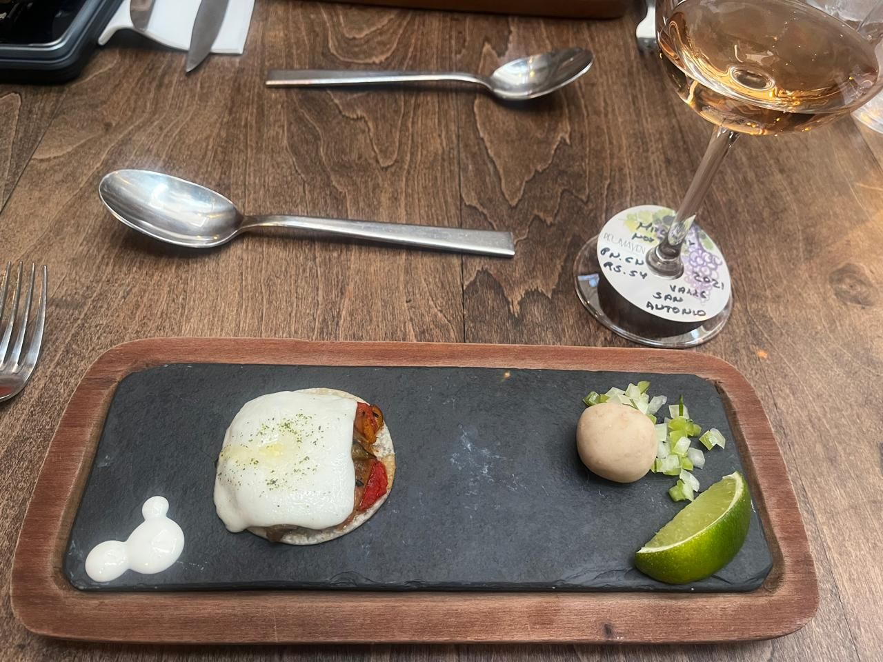 Dans un registre plus intimiste à Providencia, Benito Vicente propose une expérience à la fois simple et très maîtrisée. Dès les premières bouchées, on comprend le niveau de précision : la carte est volontairement courte, mais chaque plat est travaillé avec justesse. Vous pouvez commencer par des gildas, avec des anchois de très belle qualité, à la fois salés, légèrement acidulés, relevés par une touche de zeste d’orange — un équilibre simple mais parfaitement exécuté.